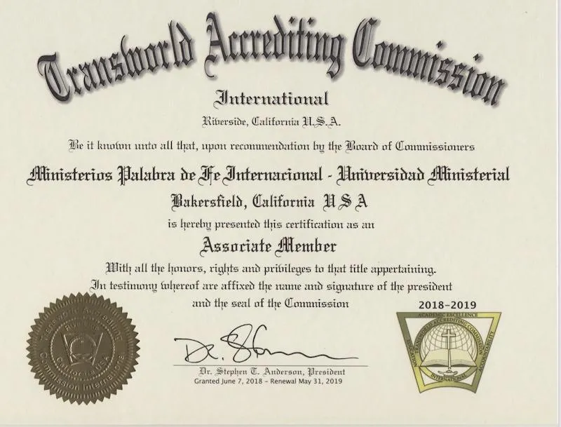 La Universidad Ministerial es una institución en línea dedicada a ofrecer formación bíblica de la más alta calidad, completamente acreditada por la agencia "Transworld Acredeting Comissions International" a una fracción de su valor real, con un compromiso inquebrantable hacia la excelencia académica y el servicio a la Obra de Dios. Nuestros programas abarcan desde Doctrina Bíblica y Liderazgo Ministerial hasta las Disciplinas espirituales y prácticas necesarias para cumplir con éxito el propósito de Dios en la vida de cada creyente. A lo largo de los años, hemos tenido el privilegio de formar, equipar y capacitar a cientos de hermanos en la fe, muchos de los cuales hoy sirven como Ministros, mientras que otros ejercen un impacto profundo en sus iglesias locales. Con un amor genuino por la obra del Señor, Dios nos ha abierto la puerta para impartir seminarios intensivos de estudio bíblico durante fines de semana completos, cubriendo una amplia gama de temas, siempre con el propósito de venir al lado de los Pastores locales y edificar la Iglesia de Cristo. Sería para nosotros un honor llevar a su congregación el seminario bíblico de su elección, coronando la experiencia con un certificado de finalización y una noche de alabanza y adoración que sin duda será de bendición para toda la iglesia.